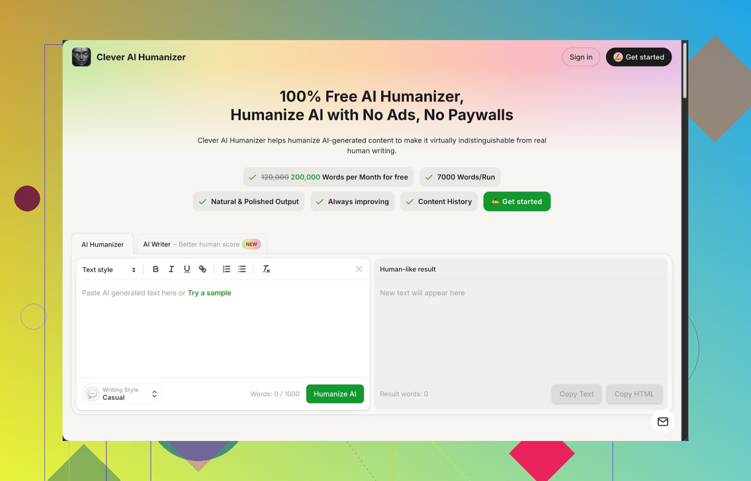 Se scrivi spesso con l’IA e combatti con i rilevatori o odi la “voce da IA”, Clever AI Humanizer rientra nella categoria “utile” per il 2026. Al momento in cui scrivo è ancora gratuito, gestisce grossi blocchi di testo e integra humanizing, scrittura, grammatica e parafrasi in un unico posto.