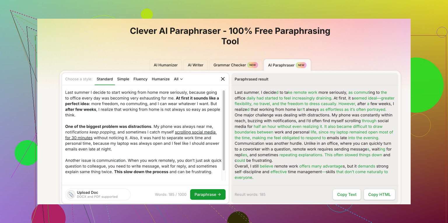 Think of it as a Clever free paraphrasing tool optimized for natural, human-sounding text that works well for content marketing, blog posts, and social captions. You’ll still need to tweak tone, but it’s closer to “assistant” than “spinner.” -