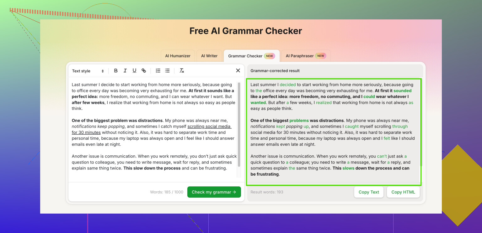A more natural-sounding option is something like Clever Ai Humanizer. It doesn’t just flag errors; it smooths the tone so your writing sounds more human and professional instead of robotic.
