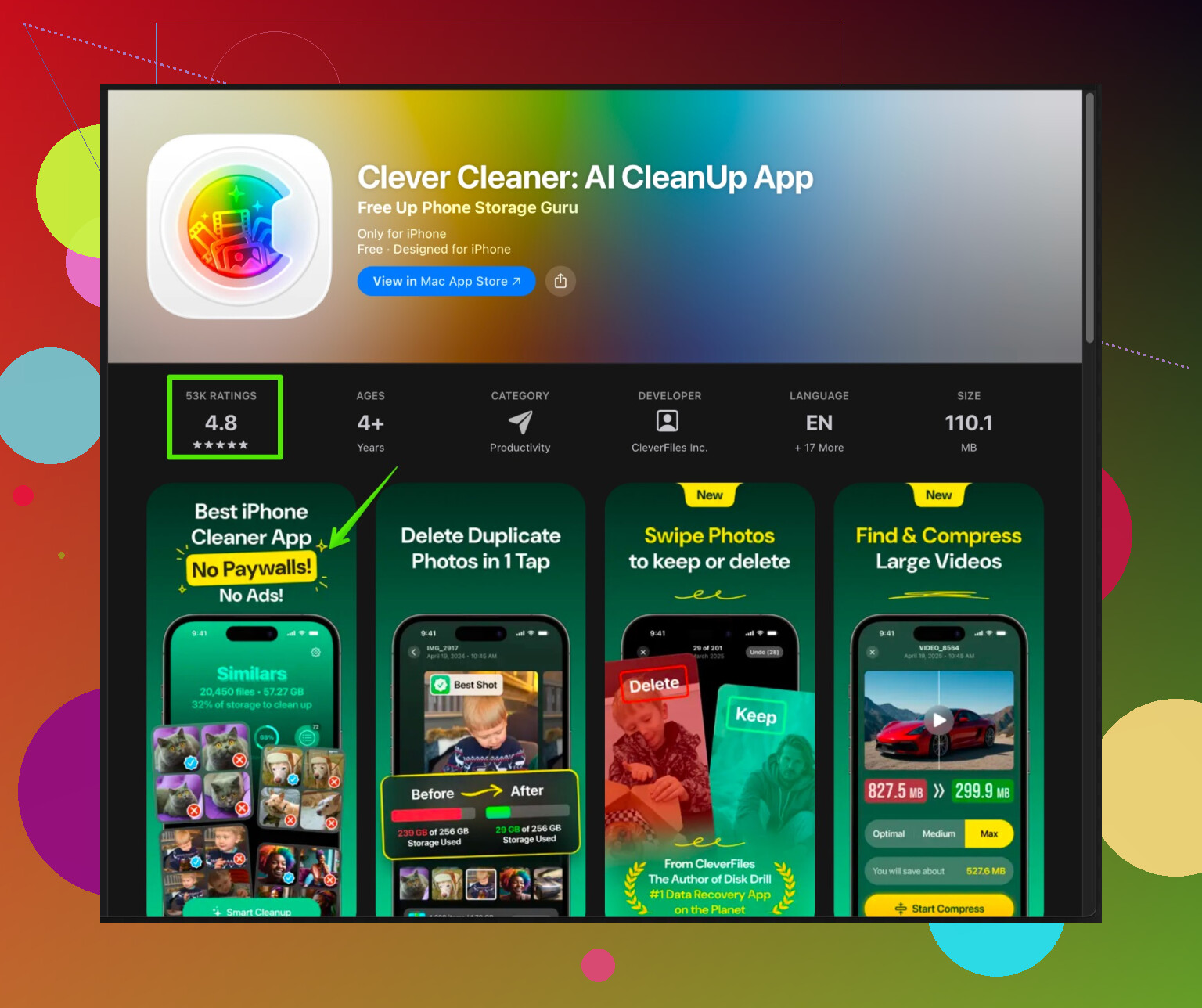 Faites un gros nettoyage de stockage avec une app comme Clever Cleaner App et les outils Stockage de l’iPhone.