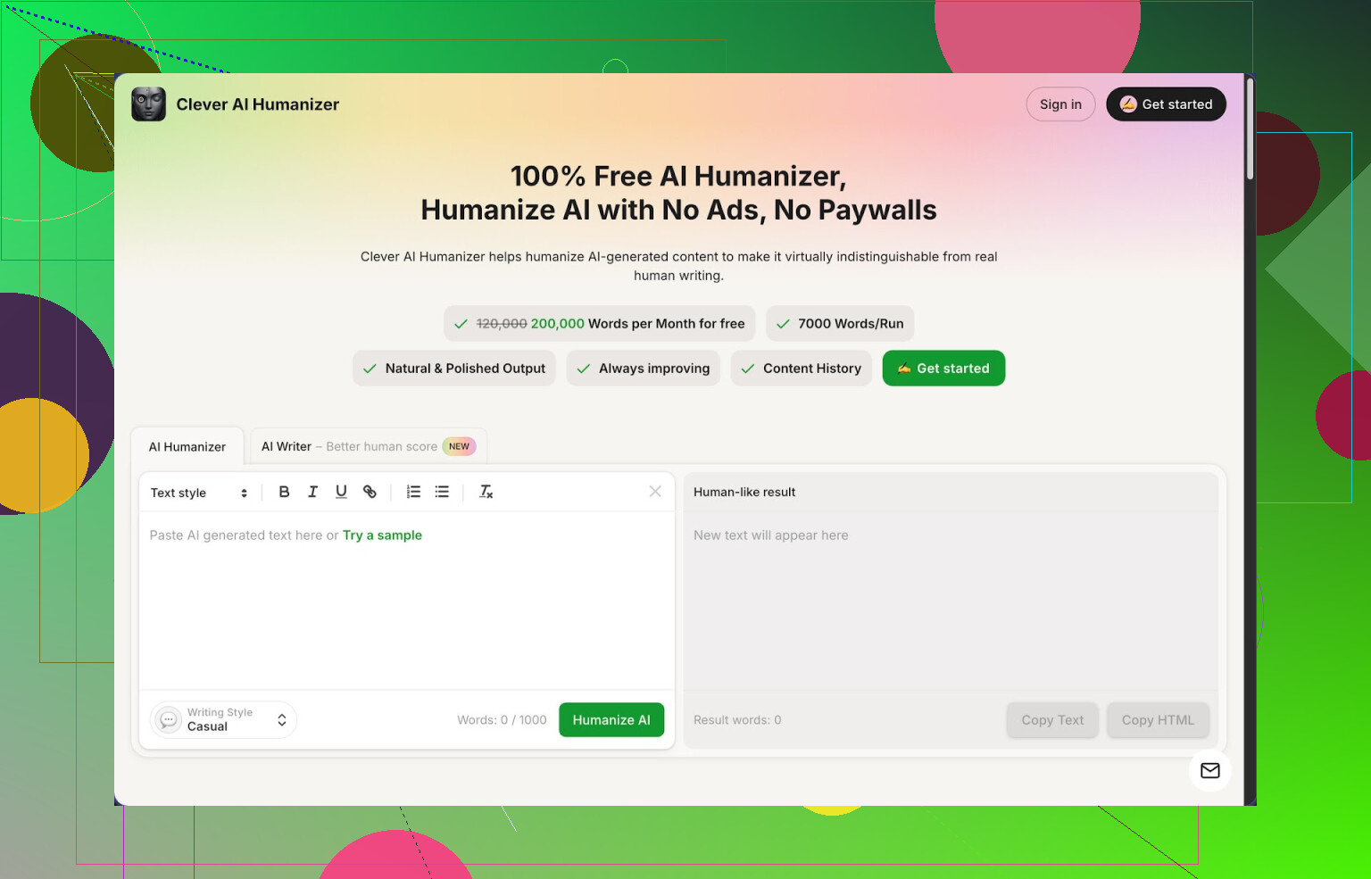 Clever AI Humanizer è finito in cima alla mia lista dopo una settimana piuttosto brutta passata a testare strumenti. Il motivo breve per cui ci sono rimasto: è gratuito, i limiti sono abbastanza alti per un uso reale e l’output ha superato i miei soliti rilevatori meglio di qualunque altro tool provato.