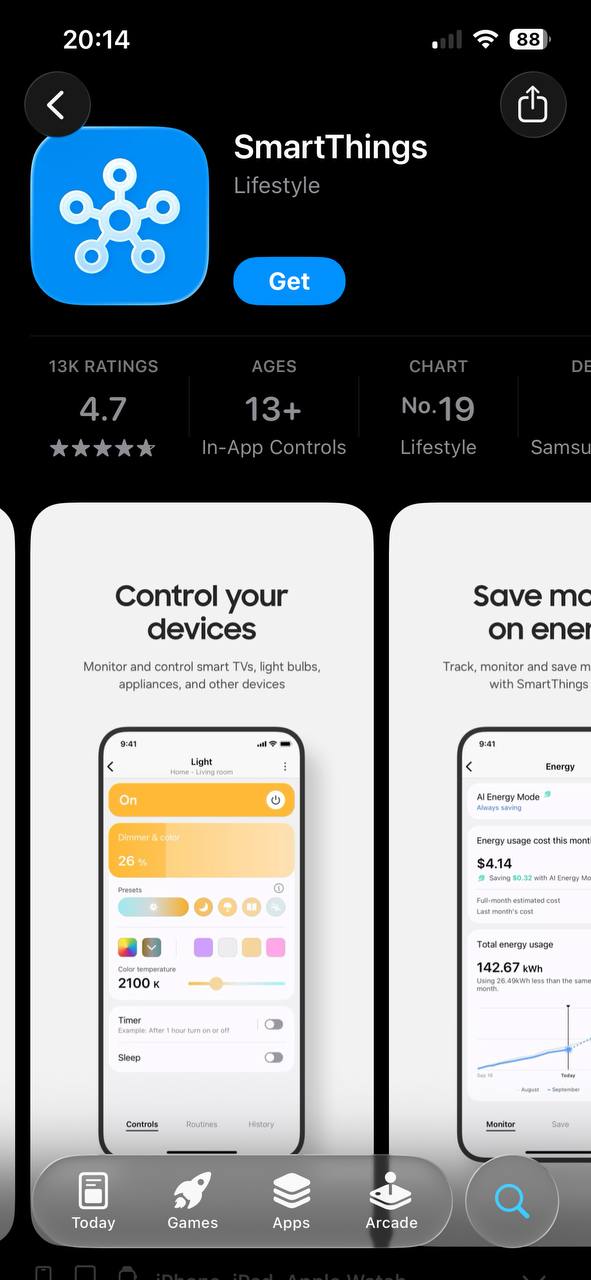 Vous étiez connecté au Wi-Fi avant que votre télécommande ne disparaisse ? Bonne nouvelle ! L’app SmartThings de Samsung va devenir votre nouvelle meilleure amie. Rendez-vous sur l’App Store ou Google Play, téléchargez SmartThings et :