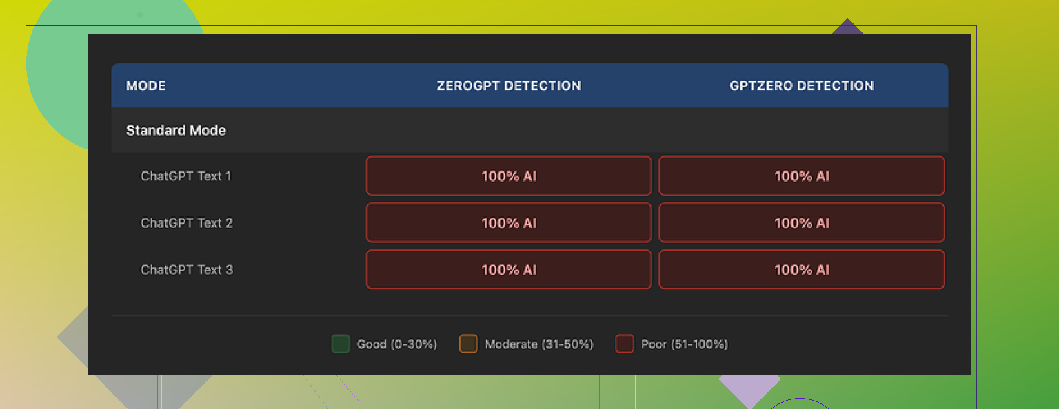 Every single rewrite from GPTinf, across all modes, was flagged as 100% AI-generated by both GPTZero and ZeroGPT. No borderline scores. No “partially human.” Full red bar.