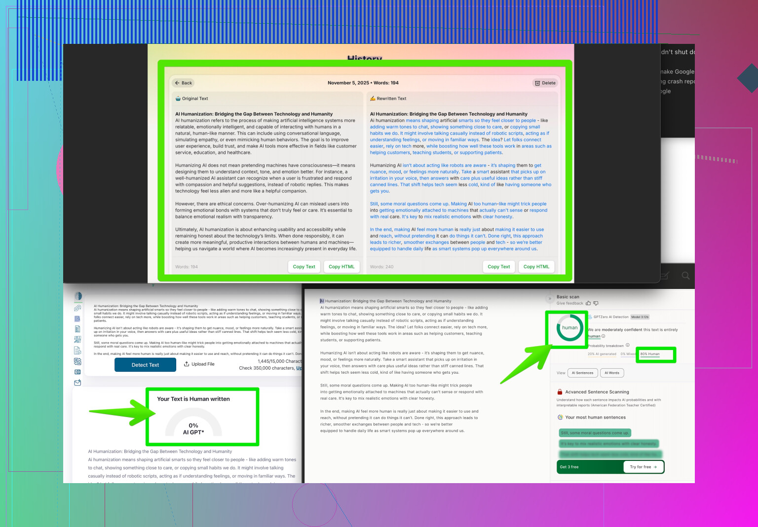 Real advice: After running AI/text through a humanizer and your checker of choice, read your work OUT LOUD. Ask: “Would my friend say this? Is the flow weird?” See if it triggers your own BS meter; often what feels off to you will trip up detectors.