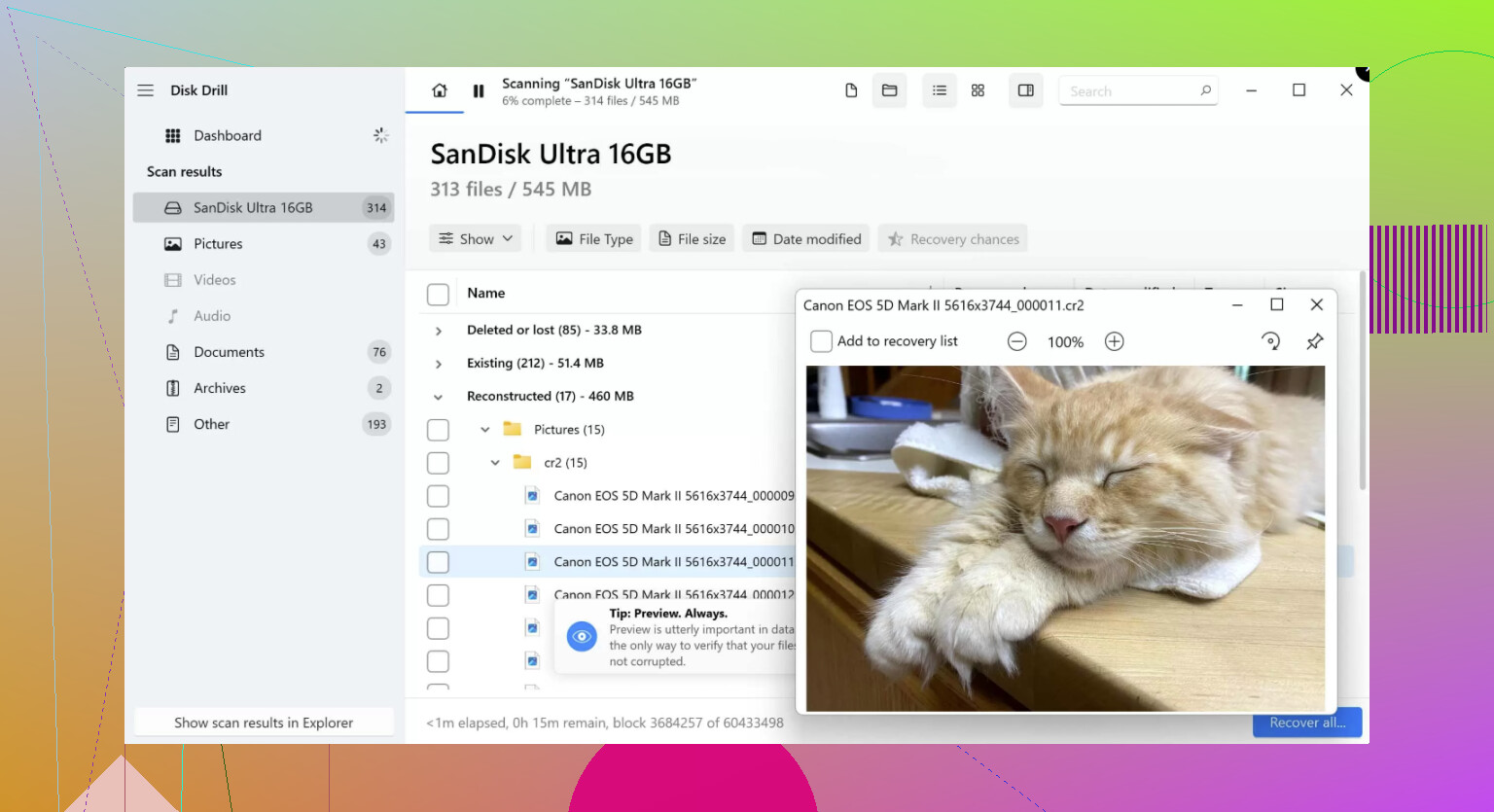 If your computer still sees the card, I’d start with Disk Drill. In my case, tools like this were the least annoying place to begin because you can scan for deleted files, stuff lost after formatting, RAW cards, corrupted cards, and missing photos or videos. The preview feature matters. I always check previews before saving anything, because it tells you fast whether the files are still intact or if the scan only found broken leftovers.