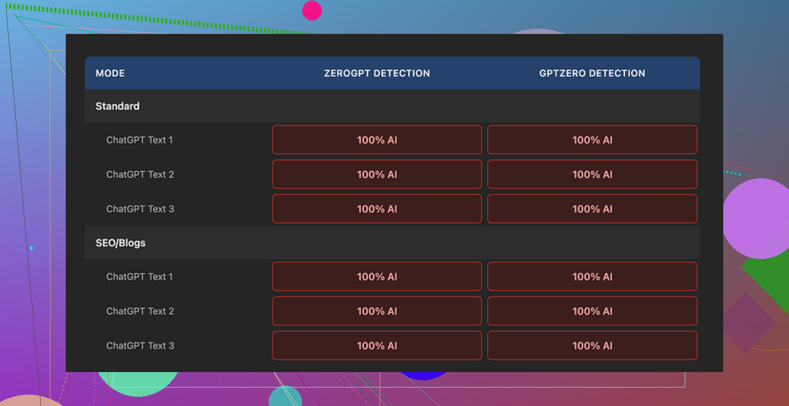 Every single sample came back as 100% AI on both GPTZero and ZeroGPT. No edge cases, no partial passes. Full AI every time.