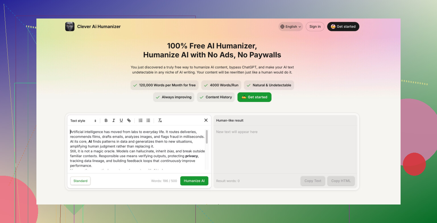 People swear by tools, but I swear at my screen when stuff still reads like a robot wrote it. Sure, Clever Ai Humanizer does a decent job roughing up that AI shine, and it’s free (huge plus). You copy, paste, and what comes out feels more like something your sarcastic cousin would write at 2am—sometimes choppy but undeniably more “alive.” The pros? It beats AI detectors most of the time and doesn’t mine your data. The con: you might still need to sprinkle your own slang, stray thought, or oddball transition in there, because “human” isn’t just about typos or run-ons—it’s flow, it’s personality.